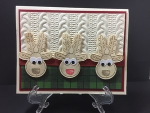 The 3 reindeer were stamped on kraft card stock and then I punched the eyes out.  I used an embossing folder with a sweater type of texture and added a little red ribbon.