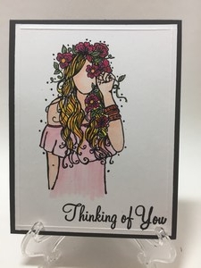 I used watercolor markers to color in her skin, clothes and flowers and copic markers for the different colors in her hair.