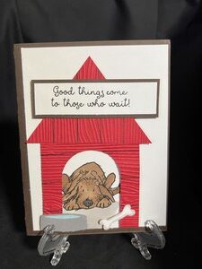 I made the doghouse from first using an embossing folder like wood on red card stock and then adding a little black ink to show some age on the house. The dog was colored right on the background using copic markers.