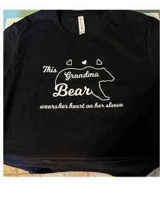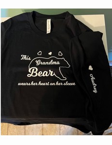 The first photo shows a bear and this cute saying, “This grandma bear wears her heart on her sleeve.” For the second photo it shows the name of the grand-baby on the sleeve.