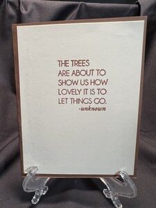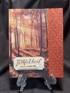 After cutting the paper in half I cut a strip of gold foil paper and then used a textured embossing folder  and added that on the side.  For the inside I added a sentiment about trees letting go of things.  This card could be good for someone who is going thru some hard times along with Thanksgiving.