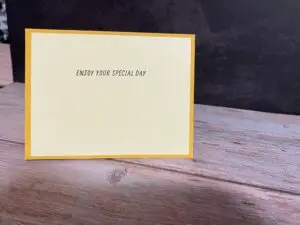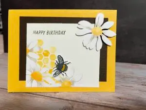 I started out with a bright yellow card base and added a little black to make the yellow pop.  then I stamped Happy Birthday in the left corner and stamped and colored the bee.  For the inside, I stamped “Enjoy your special day.”