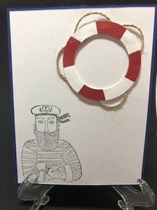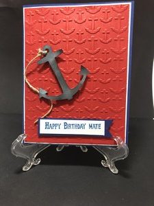 Keeping with the nautical theme here is a card I made for one of my card groups I am in. I used an anchor embossing folder for the background and an anchor on the front. I tried making the anchor look aged by using black ink along the edges. On the inside I stamped a sailor and made a life preserver.