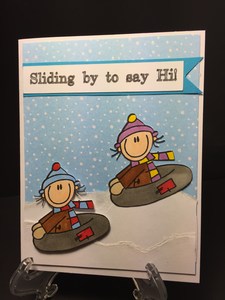 Both of these cards deal with winter, yes there is some snow where I live and I do have winter birthdays in my family. This first one is a digital stamp from Bugaboo stamps, it is of a boy sledding on a tire tube. I duplicated the boy and colored them with my copic markers and added some glitter along the torn edge of the paper.