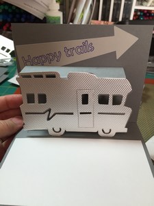 I kept the front of the card simple because I wanted the recipient to be surprised when they opened the card. I added some textured aluminum paper to the front of the camper to make it look like the old time campers.