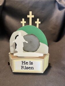 I first die cut all of the pieces and then inserted each layer to represent Jesus leaving the tomb. I used wink a stella on Jesus to appear heavenly but its hard to see all the sparkle and I inked the edges of the rock. On the back there is a small area to write a private message to someone like Happy Easter.