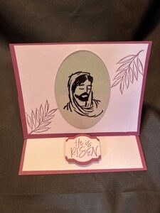 I die cut the center out first and then added a stamped Jesus that is embossed with black ink. I then stamped several palm leaves on the front and one on the inside.