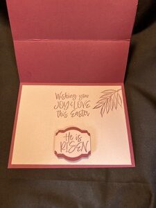 For the inside I stamped Wishing you joy and love this Easter and then I stamped He is Risen and popped it up on dimensionals to hold the easel card in place.