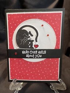 I used black card stock for the base and then layered a white and then a patterned red designer paper. I then die cut a circle and stamped the kitty. I heat embossed the black strip with white embossing powder and added a couple of red rhinestones to finish off the front.