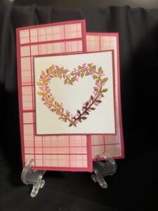 I die cut a gold heart and overlayed it on top a pink stamped heart. For the background I used pink plaid paper on top pink card stock.