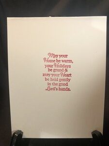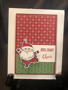 I used thick white card stock for the base and then added a red mat and two different kinds of designer paper. I then stamped Holiday Cheer to the side of Santa. For the inside I stamped a simple sentiment and left plenty of room to write a message.
