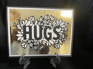 I die cut the word hugs and the flowers and leaves out of black card stock and mounted the word on top of gold foil paper to give it shine. I left the inside blank so that it could be written for any occasion.