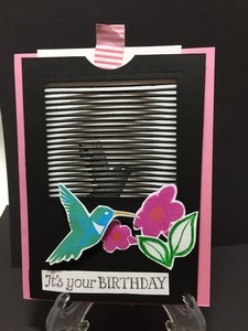 This card is fun to make but it does take some time to create. The recipient will love moving the card up and down. When you pull the tab at the top it will look like the hummingbird’s wings are moving.
