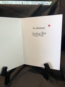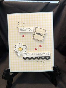 I used an egg stamp and a bread stamp to create this little cutie. Stamped a couple of splatters and hearts on the front and popped up the egg and bread. For the inside it says, “Hi valentine, sending love your way.