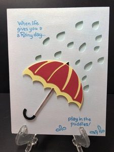 For this card I wanted to add dimension to the card. I used my Cricut machine and made raindrops. I then die cut the parts of an umbrella and popped it up on dimensionals (foam tape). Great card for the Springtime!
