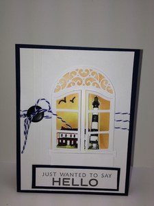 A little Hello card for you. I recently purchased this window die and wanted to see how it would look with a lighthouse in the background. I think it turned out pretty good. Take a peek.