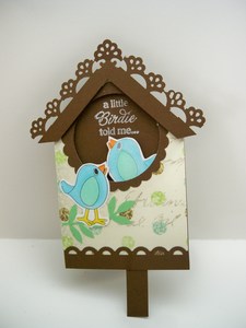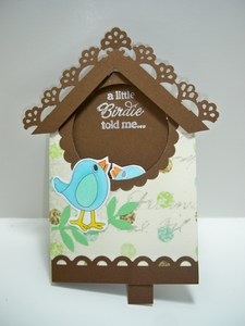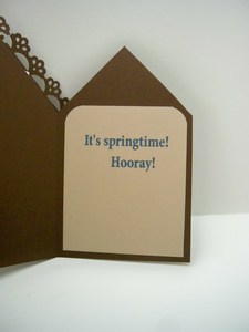 Can you feel it yet?  Springtime is just around the corner.   So to start your spring off to a good start here is a cute little birdie card.  the first picture shows one bird looking into the house then along comes a second one that pops up when you pull the tab.  The inside tells it all.  Springtime hooray!
