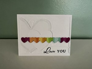 I first die cut several hearts out of white card stock and stacked them towards the left side of the card. Then I colored a band of hearts in rainbow order and popped them up on dimensionals. For the final part of the card I stamped love you in the lower right corner.