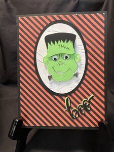 It is a standard A2 card and the base is black card stock I then layered an orange and black striped paper. From that point I die cut good ole Frankie out of green and black card stock and put him together. I added a small sentiment of boo at the lower right corner in black and green card stock.
