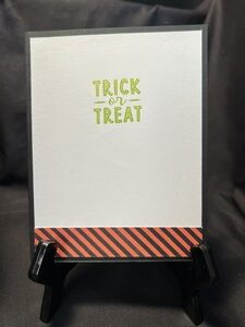 For the inside I stamped Trick or Treat in lime green ink and added a small border of the striped paper from the front to finish off the card.