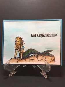 This was a fun card to make, maybe because I enjoy coloring. I embossed the mermaid with a black glitter embossing powder so it sparkles, but it is hard to see.