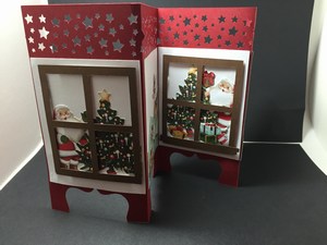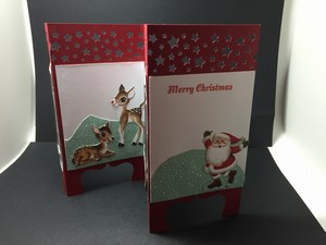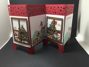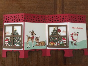 This card was created using Stampin Ups decorative paper pack.  I hand cut all of the designs and added windows to some so it would look like Santa is putting presents under the tree.  The other two frames are Santa and some of his deer playing on the ice.  Cute huh!