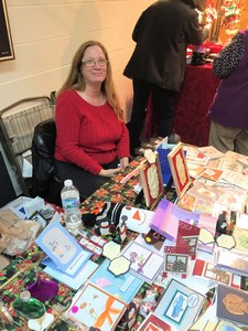 I know I have been missing as of late, but for a good reason, let me explain.  I was asked to be a part of a craft show that benefits the homeless and less fortunate in a school district where I work.  I have been making cards to sell for the past month and a half. Here is a photo of my table.