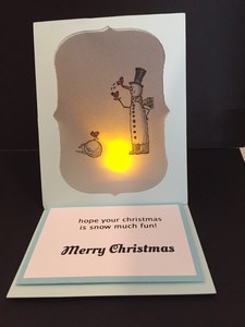 NativityFor my next one I have an easel card made with Stampin Up Stamps.  I added a battery candle to the back and used vellum to allow the light to show through.  The lit one doesn’t do it justice in the picture, but you get the idea.  It has a slight flicker of  light.