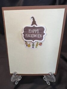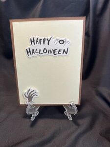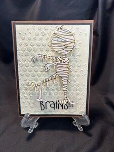 I first stamped and then colored the mummies so that it looked like dirty cloth. The background was created using an embossing folder and I printed the words Brains and Time to unwind onto vellum.  I then added a wobble to the back of the mummies so they would have some movement.  For the inside I used some Halloween stickers that I had.