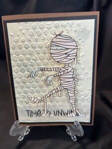 I first stamped and then colored the mummies so that it looked like dirty cloth. The background was created using an embossing folder and I printed the words Brains and Time to unwind onto vellum. I then added a wobble to the back of the mummies so they would have some movement. For the inside I used some Halloween stickers that I had.