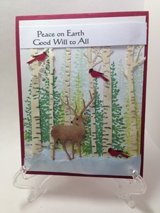Peace on Earth, don’t we all wish for this to happen. This card just screams peacefulness. Can’t you hear the sounds of the forest, the animals scurrying around and the birds flying by. Most of the card is made with die cuts and some stamping in the background.