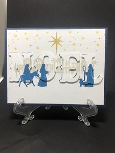 I used the Stampin Up Nativity set for this card and some letter dies. I first cut out the letters I wanted to use then stamped on top of the letters. I then made 2 more sets of letters and stacked them on top of each other. Before I reattached the letters I added foam tape to the backs of each letter to give the letters height.