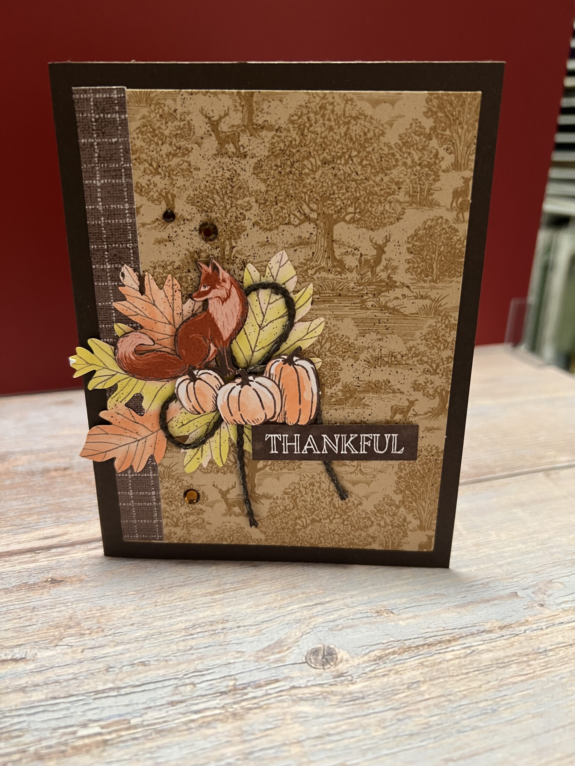 This card could easily be a birthday card or a Thanksgiving card. The colors just scream fall to me. I first stamped Wishing you the