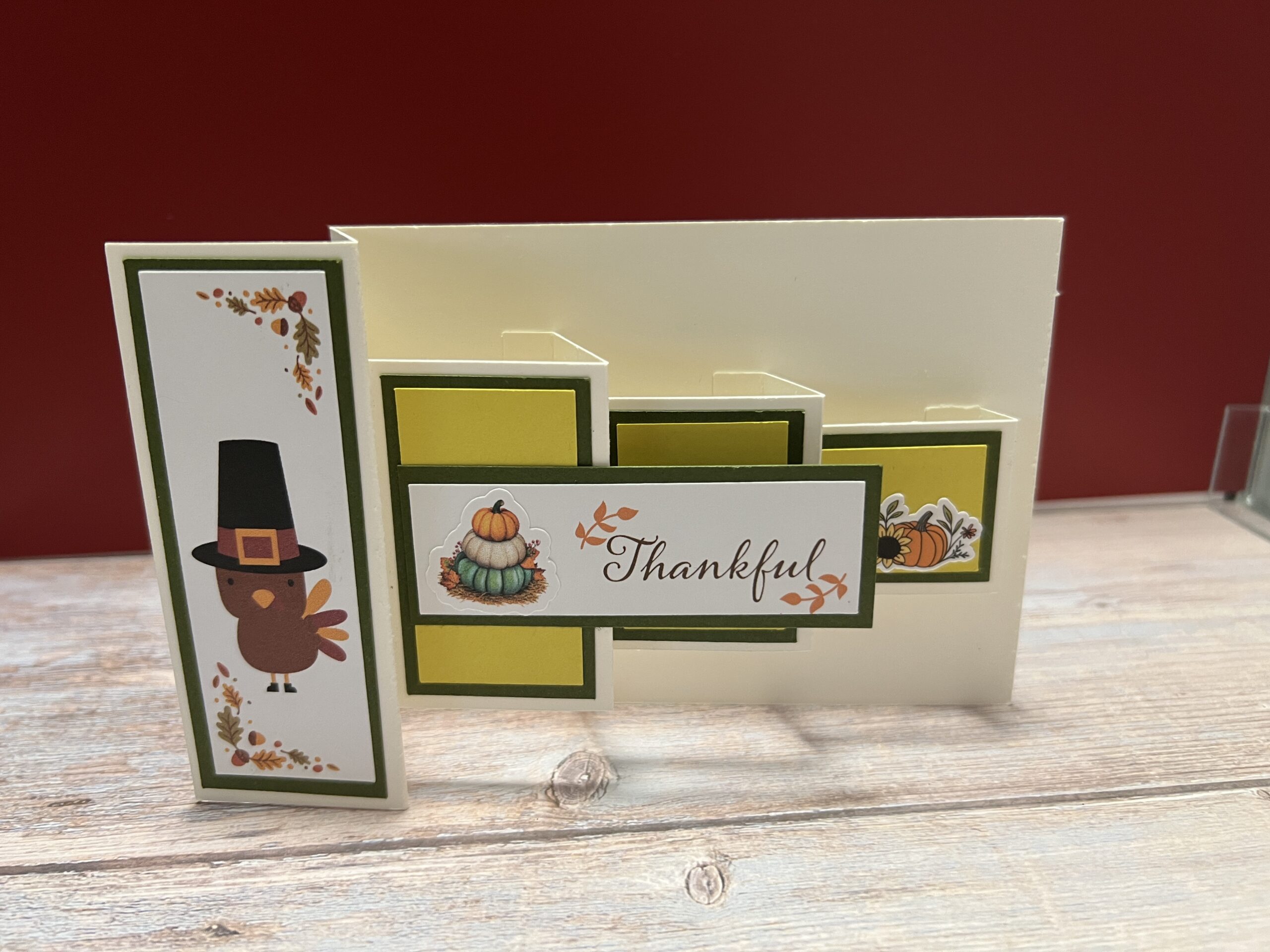 I made this card for the ladies in my card group. The front is a sideways step card and I think the turkey is so