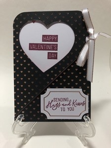 These are my final cards for Valentine’s Day. I used the Stampin Up Paper Pumpkin Kit and added my own twist to them. If you untie the bow there is a white card in a pocket where you could put your own message. I die cut the front out in a heart heart and added the two messages.