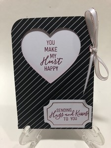 These are my final cards for Valentine’s Day.  I used the Stampin Up Paper Pumpkin Kit and added my own twist to them.  If you untie the bow there is a white card in a pocket where you could put your own message.  I die cut the front out in a heart heart and added the two messages.