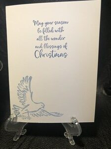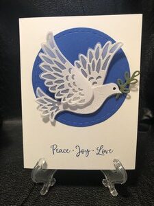 As for the second card, I die cut a dark blue circle and attached the dove in the center of the circle, I then stamped the same message of Peace, Joy, and Love towards the bottom of the card.