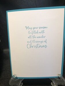 For the first card I embossed teal cardstock for added texture and added a small piece of gold ribbon towards the bottom with a small message of Peace, Joy, and Love.