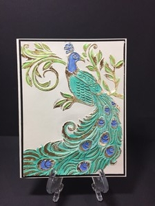 I also had to make a peacock card. This was all experimental and still a work in progress. I first embossed a peacock on card stock and then applied glue to the raised areas. After I let the glue dry, which it stayed tacky, I applied gold foil to the tops of the raised areas. I then used watercolors and colored in the lower areas of the feathers with blues and greens.