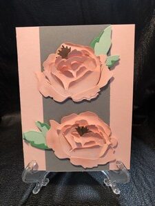 For this card I added two die cut peonies in pink cardstock with pink ink added on the edges and two shades of green for the leaves. I used gray cardstock for the middle section to add some emphasis to the flowers.