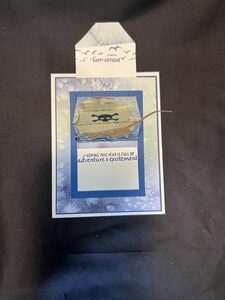 I first die cut the ship and sails out and then added it to the base where the water is. It doesn’t show up to well but as you slide the card up it says, Happy Birthday at the top with the seagulls and as the slider goes up it reveals the message, Hoping this year is full of adventure. The white base on the back is where a personal message can be written.