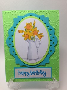 This pitcher of daffodils is just screaming Spring. I loved how the colors turned out. Great little birthday card for someone.