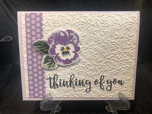 Here are a couple of easy cards that a beginner can make. I used a couple different embossing folders and stamped a couple of purple pansies. Add a little designer paper and you have a couple of cards.