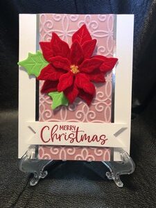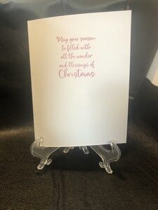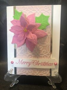I die cut the poinsettias and leaves out of velvet paper and used some vellum in the background. I then added a small strip of silver along both sides to add a little bling. For the center of the flowers I used a little bit of yellow stickles glue. On the pink card I used some pearls near the Merry Christmas. I used two different sentiments on these cards. You can see the red one pretty good but the pink one says,”May your season be filled with all the wonder and blessings of Christmas.”