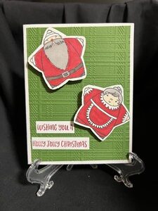 I first embossed the green card stock with a plaid the I stamped and colored Santa and Mrs. Clause with red and black markers. I stamped the words Wishing you a Holly Jolly Christmas in red ink. Both Santa and Mrs. Clause were put on the wobble so that kids could play with the card.