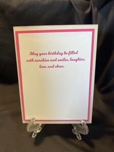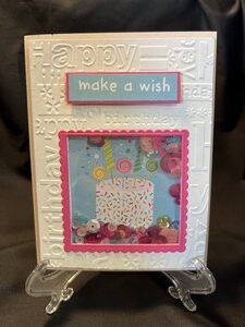 For the front of the card I used an embossing folder and embossed Happy Birthday all around on white card stock. I die cut the words make a wish and framed it out on pink card stock and then added a small pink frame around the shaker part.