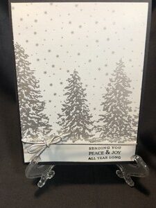 If you like silver and white this is a card for you.  The silver card stock is so pretty against the white background that I didn’t need to add much more to the card. I added a small sentiment on the bottom and some silver twine with a bow.