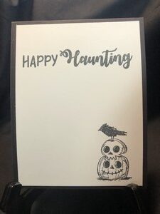 This would make great gift tags along with being a card. I stamped out the skeletons and die cut a couple of pumpkins to put in the skeleton’s hands. I then added a couple layers of designer paper and popped the skeletons on dimensionals. For the inside I stamped Happy Haunting and added a skull pumpkin and raven sitting on top. I used a glitter pen on the eye sockets and nose sockets of the skeletons.