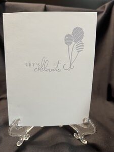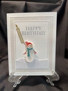 This cute snowman was created from one of the kits I received in December from my card group. I first stamped the Happy Birthday sentiment in the center and then die cut a candle. I used a felt snowman on top of a snow hill that I created by tearing white card stock. For the inside I stamped a birthday sentiment and added balloons.