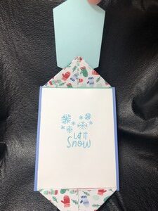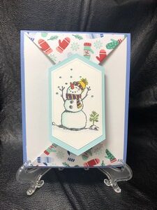 I used both Stampin Up designer series paper and also stamps for this cute snowman. The sentiment on the inside is “Let it snow,” and a few extra snowflakes to go around.